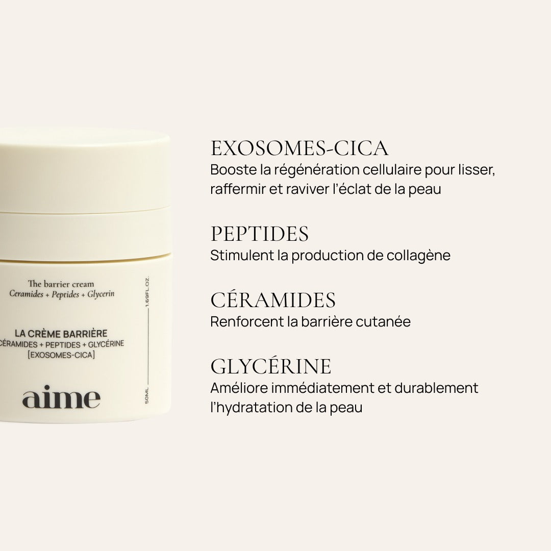 La Crème barrière est la 2e étape de la routine du matin et la 3e étape de la routine du soir du Vestiaire de peau™ développé par Aime. Utilisable comme crème de jour et crème de nuit, elle hydrate intensément la peau sans fini gras, tout en lui rendant un aspect plus jeune et apaisé.