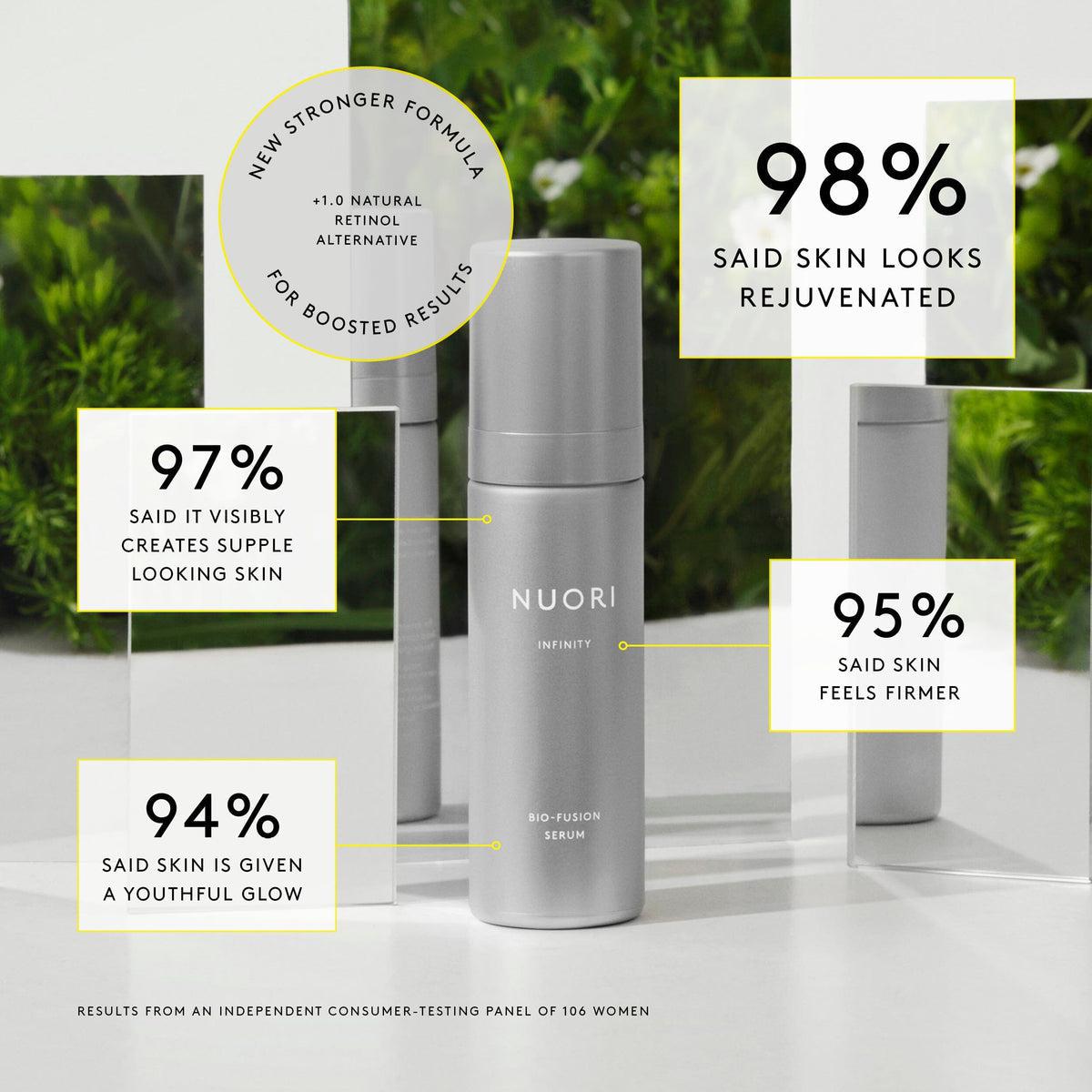 Nuori's Infinity Bio-Fusion A+ Serum is a powerful treatment for mature and wrinkled skin. Boosted by next-generation bioengineered active ingredients, it targets the appearance of wrinkles and dull complexion. It gradually reveals smoother, more supple and radiant skin.
