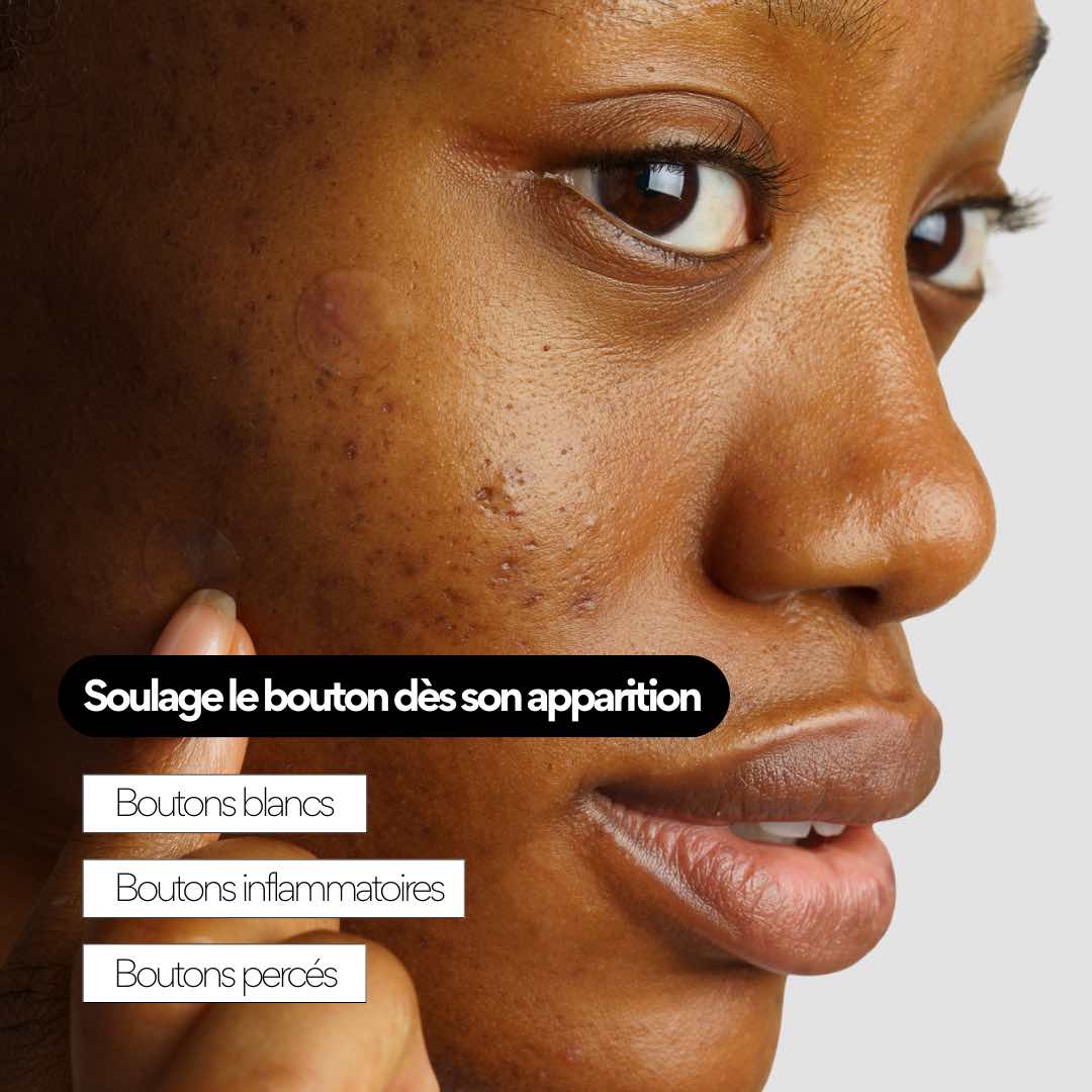 Des patchs hydrocolloïdes à coller sur les boutons pour les soulager dès leur sortie, absorber leur contenu et prévenir l’apparition de marques post-imperfections.