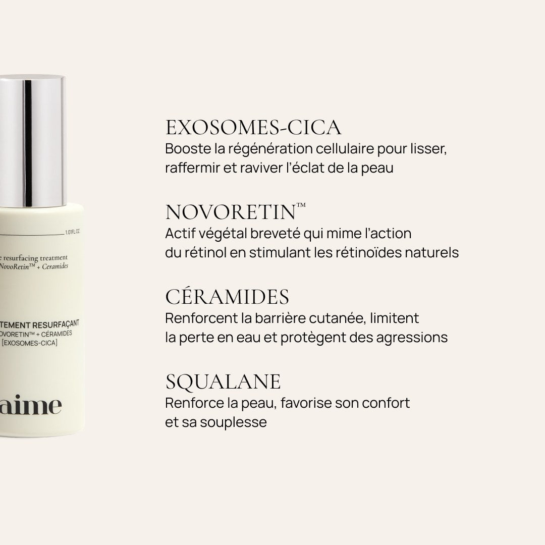 Le Traitement resurfaçant est la 2e étape de la routine du soir du Vestiaire de peau™ développé par Aime. C’est le geste essentiel pour accompagner la peau dans son cycle de régénération nocturne. Au réveil, il permet d’obtenir un grain de peau plus fin ainsi qu’un teint lissé, homogène et radieux.