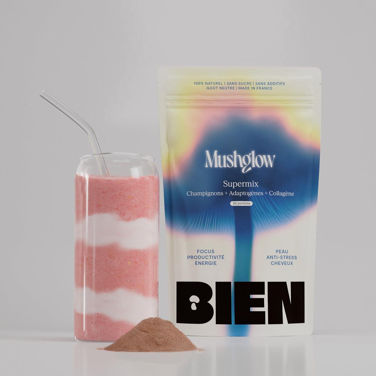 Le Mushglow de la marque BIEN est un complément alimentaire sous forme de poudre prête à diluer dans vos boissons favorites. Sa formule réunit 6 ingrédients beauté & bien-être d’exception dans des doses cliniques 2 à 3 fois plus efficaces. Elle contient du collagène de membrane d’œuf et de la L-Théanine ainsi que des extraits de lion’s mane (= hydne hérisson), de cordyceps, de chaga et de maca.