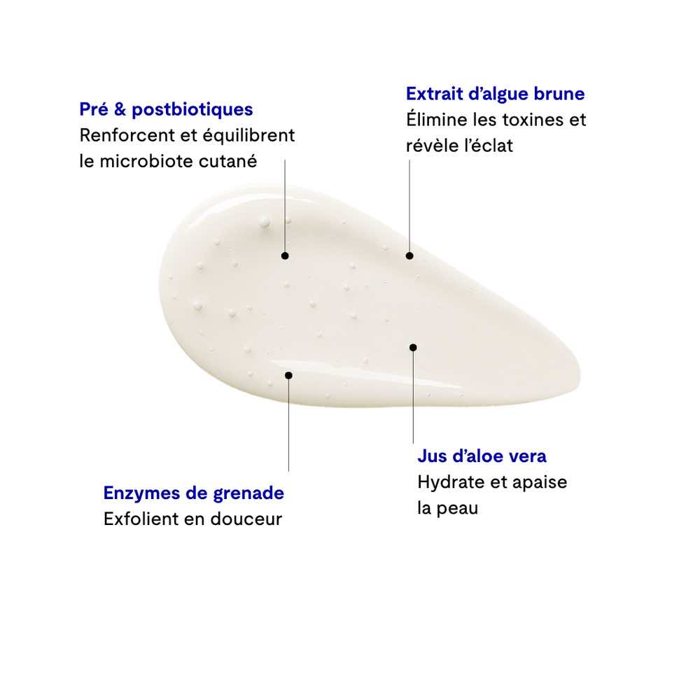 Un gel nettoyant exfoliant bio qui booste l’éclat de la peau sans la sensibiliser grâce à ses enzymes de grenade et son complexe signature microbiote-friendly.