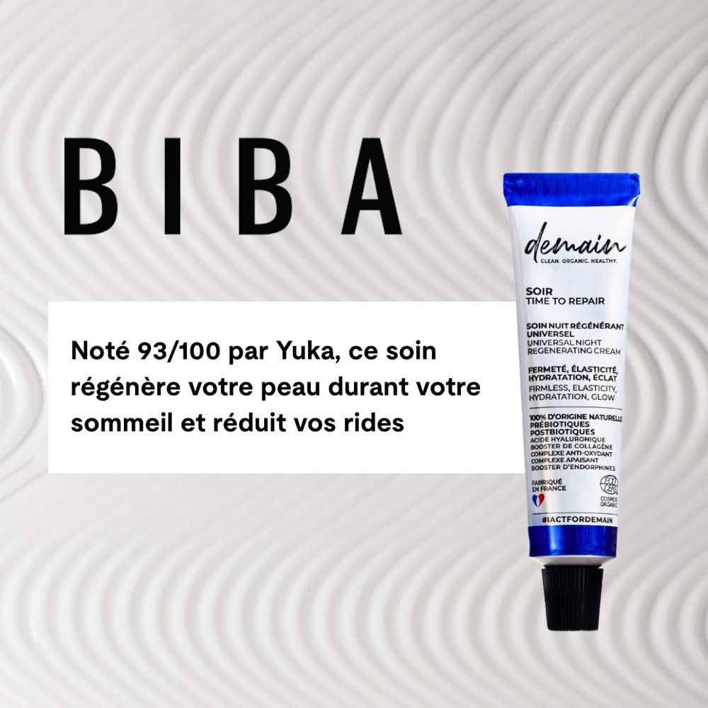 Time to repair de la marque Demain Beauty est une crème de nuit adaptée aux besoins communs à tous les types de peau. Sa formule intensément régénérante favorise le turn-over cellulaire nocturne tout en douceur et en sensorialité. Réveil après réveil, elle assouplit, égalise et raffermit la surface de la peau avec une texture caressante qui accompagne à merveille l’endormissement.