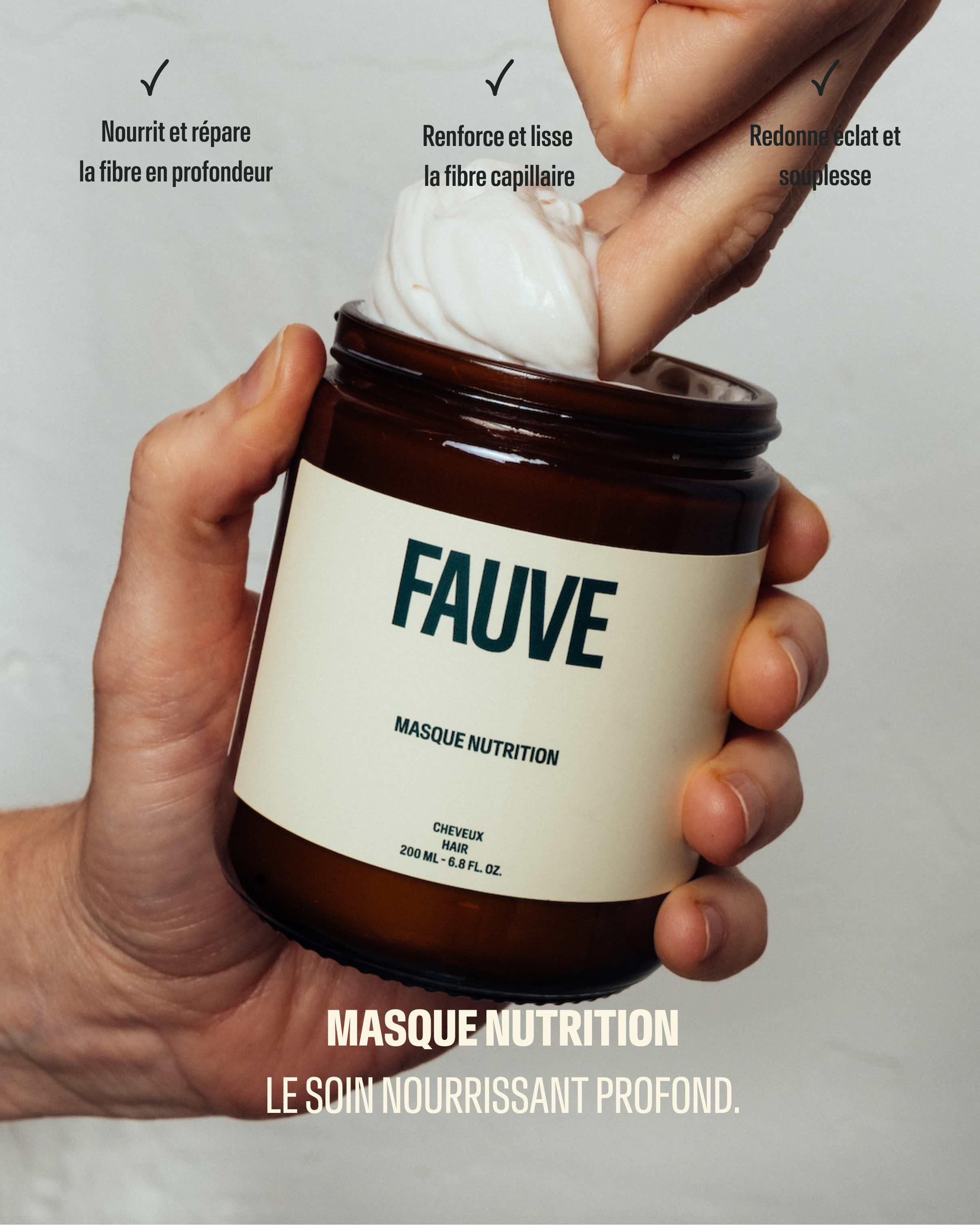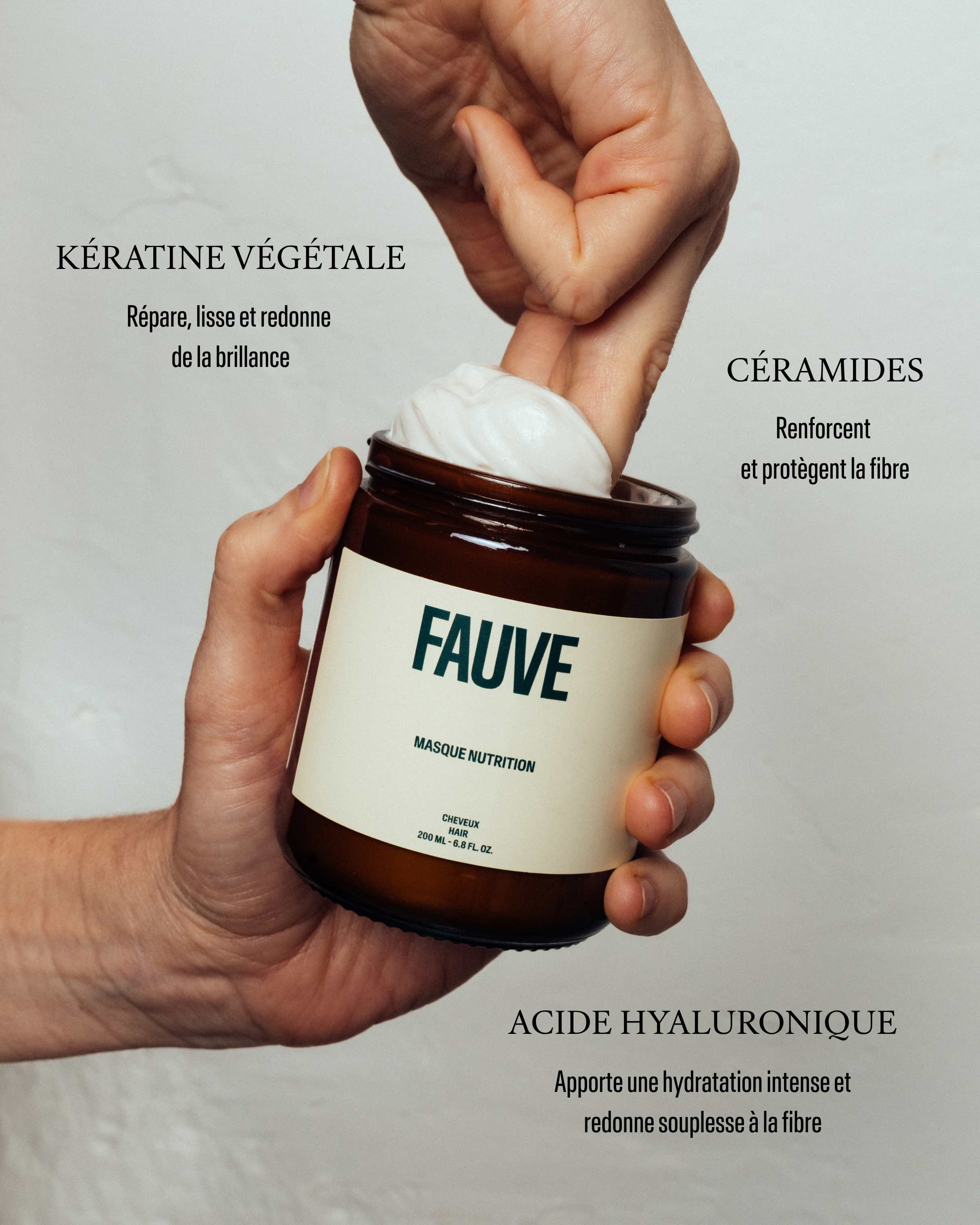 Le masque nutrition de la marque Fauve est un soin intensément nourrissant et réparateur destiné à rebooster les cheveux secs et sensibilisés. Sa formule à 97 % d’ingrédients d’origine naturelle mélange trois actifs revitalisants dans une texture crème riche au parfum délicieusement lacté.