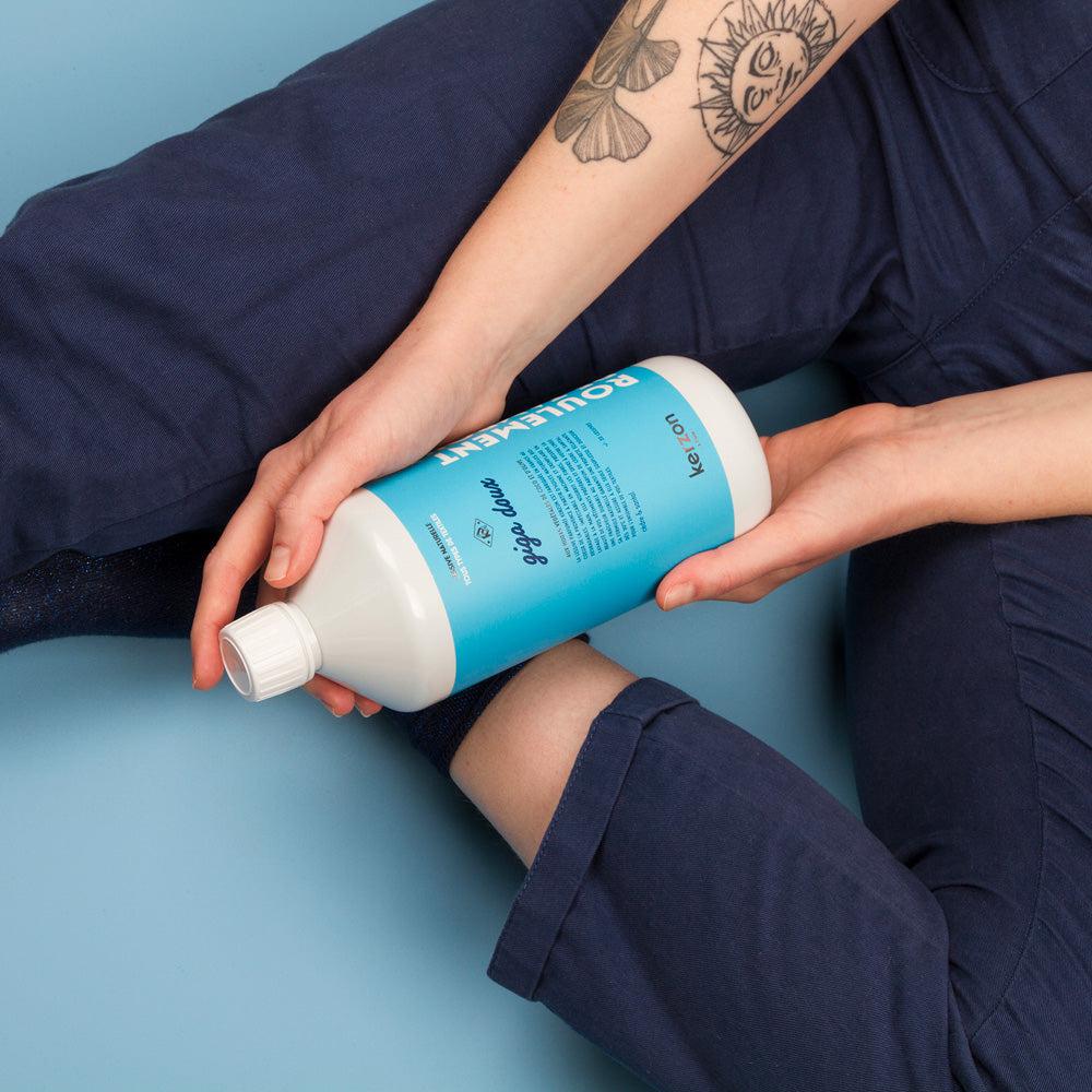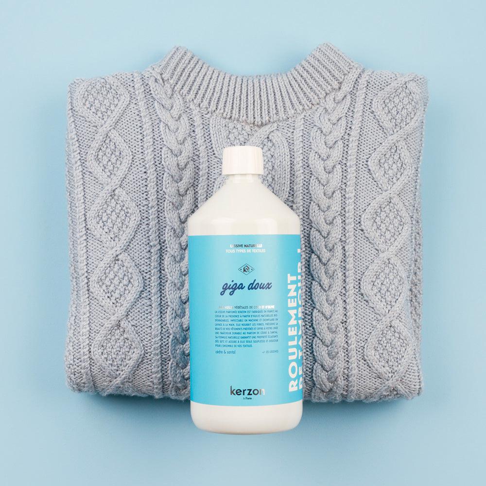 La lessive naturelle Giga Doux de Kerzon est on ne peut plus passe-partout. Elle lave tout type de textile, à toute température, en machine ou à la main.