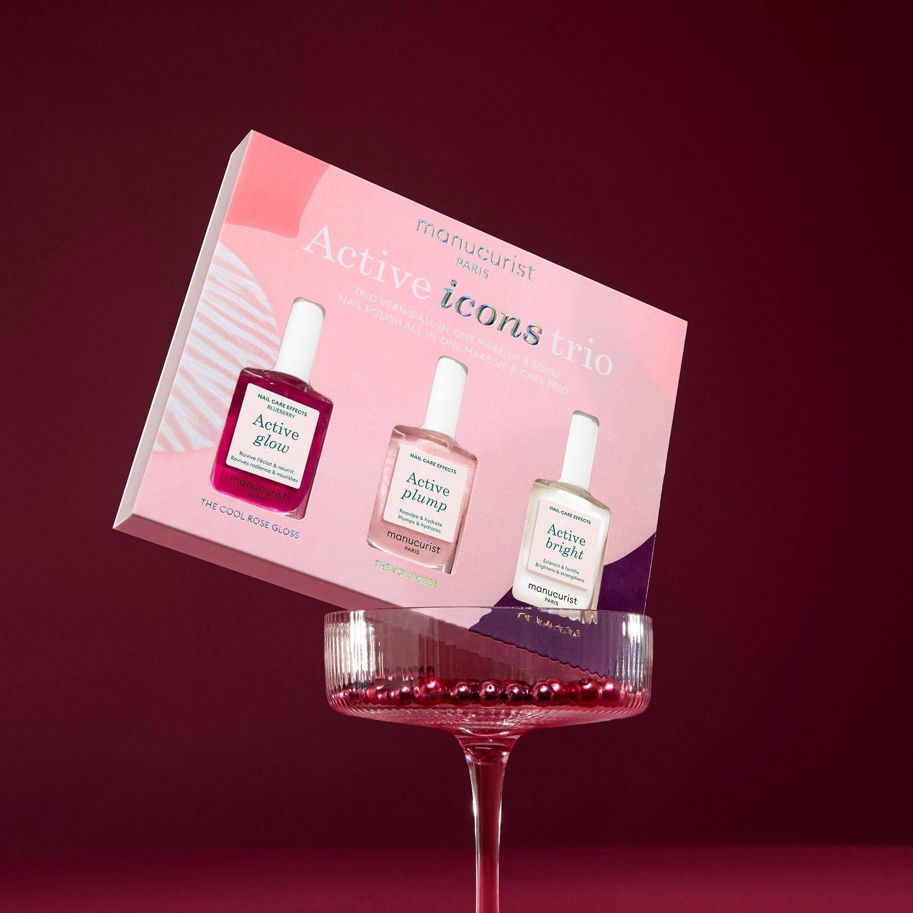 Le Active™ Icons Trio de Manucurist est un coffret de Noël qui renferme trois vernis iconiques de la marque. Leur formule all-in-one embellit les ongles avec de puissants actifs réparateurs, nourrissants, régénérants et fortifiants. Composée de + 74,5 % d’ingrédients bio-sourcés, elle combine une tenue jusqu’à 7 jours (sans base coat ni top coat) à une intensité modulable en une ou deux couches.